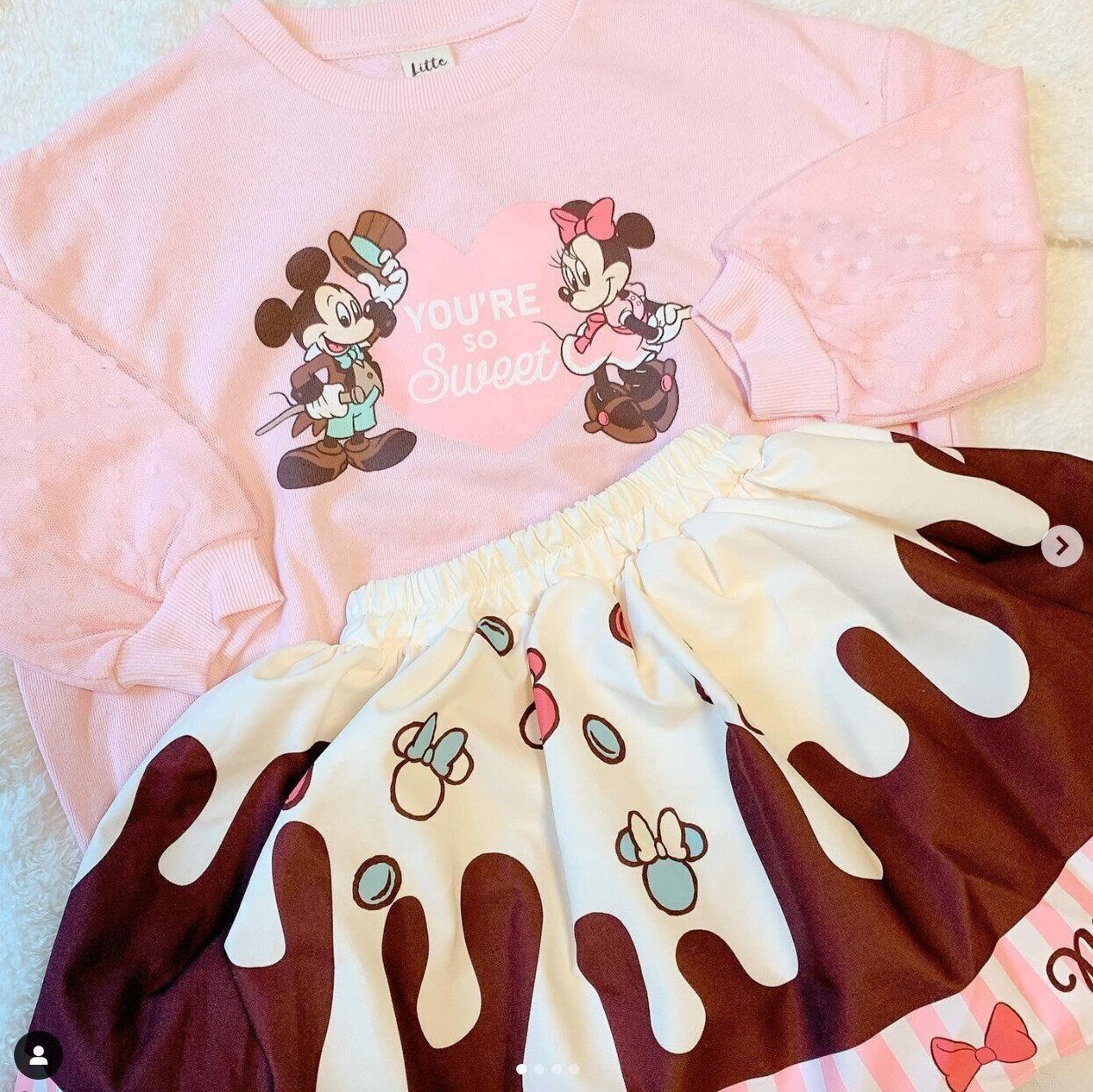 Tomoさんがゲットしたのは、こちらのトレーナーとスカート。トレーナーにはミッキーマウスとミニーマウスがプリントされており、そで部分はドット柄のチュールが重なっているようです♪ スカートはチョコレートを溶かしたようなデザインで、とても可愛いですよね!