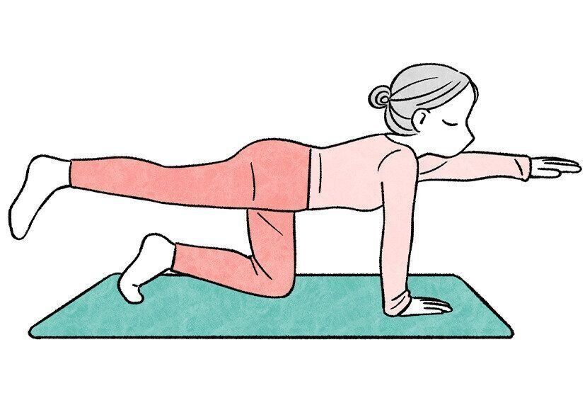 おしりとおなかに効くポーズをとるのもおすすめ。両手・両ひざを床と垂直になるようについた状態で、片脚を後ろに向けて伸ばし、床と平行になるくらいに上げたところでキープ。その状態で脚と反対の手をゆっくり床から離して、前に伸ばし、10 ~ 20秒キープ。反対も同様に。