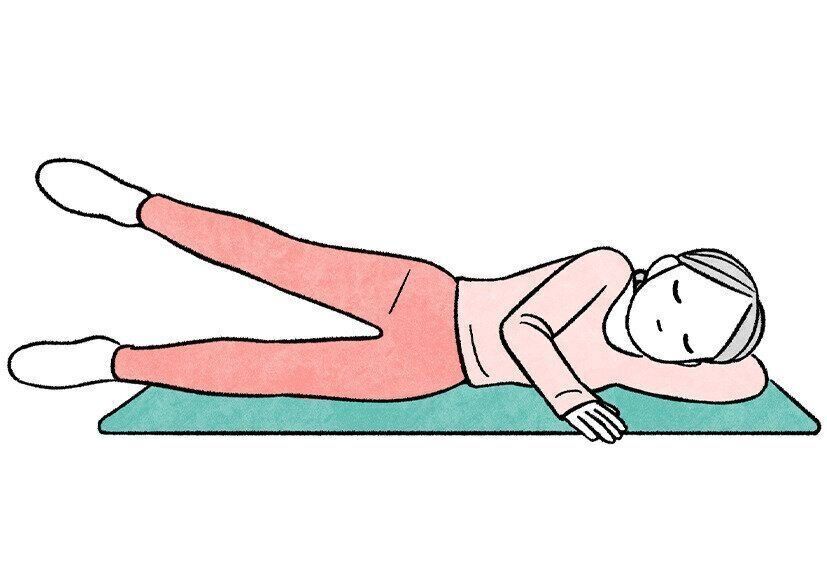上の脚を天井方向に上げていきます。脚は伸ばしたまま、脚のつけ根から上げるようにしましょう。ゆっくり10回、上げ下げを繰り返し、反対も同様に。