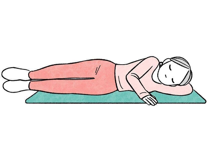 床の上で横向きの姿勢になります。下になった手はひじを曲げて頭の下に置き、上になった手は胸の前くらいの位置の床に置きます。このとき、頭からつま先までが一直線になるように意識しましょう。