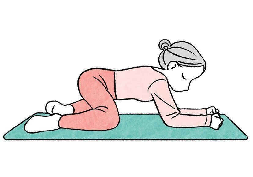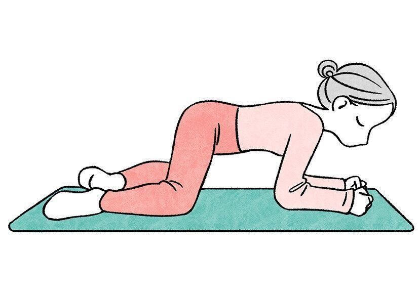 おしりから上半身を後方にゆっくり移動し、おしりをかかとに近づけていきましょう。5 ~ 10往復、できる範囲でやってみて。ひざが痛い人は、マットやラグの上で行うと◎。股関節(こかんせつ)に痛みがあるときは、無理をせず中断しましょう。