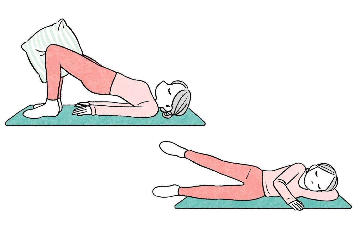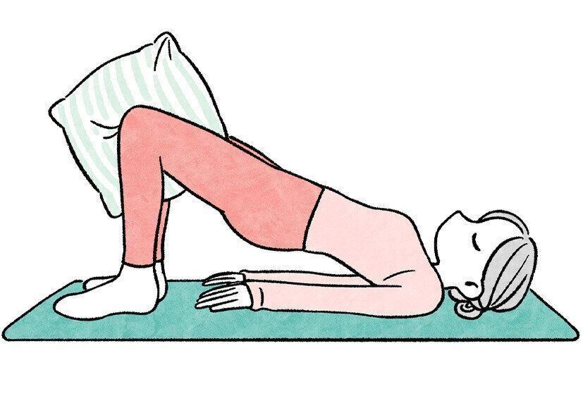 息を吐きながらおしりを上げ、肩からひざまでが一直線になるようにします。その状態で深呼吸をし、内ももを引き締めて、挟んでいるクッションをつぶしましょう。10秒ほどキープしたら、おしりをゆっくり下げます。この動きを2 ~ 3セット繰り返して。
