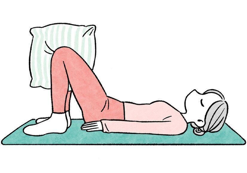 あお向けの状態で脚は肩幅くらいに開いてひざを立てます。太ももの中間~ひざの位置にクッションなどを挟み、かかとがひざの下になるようにします。