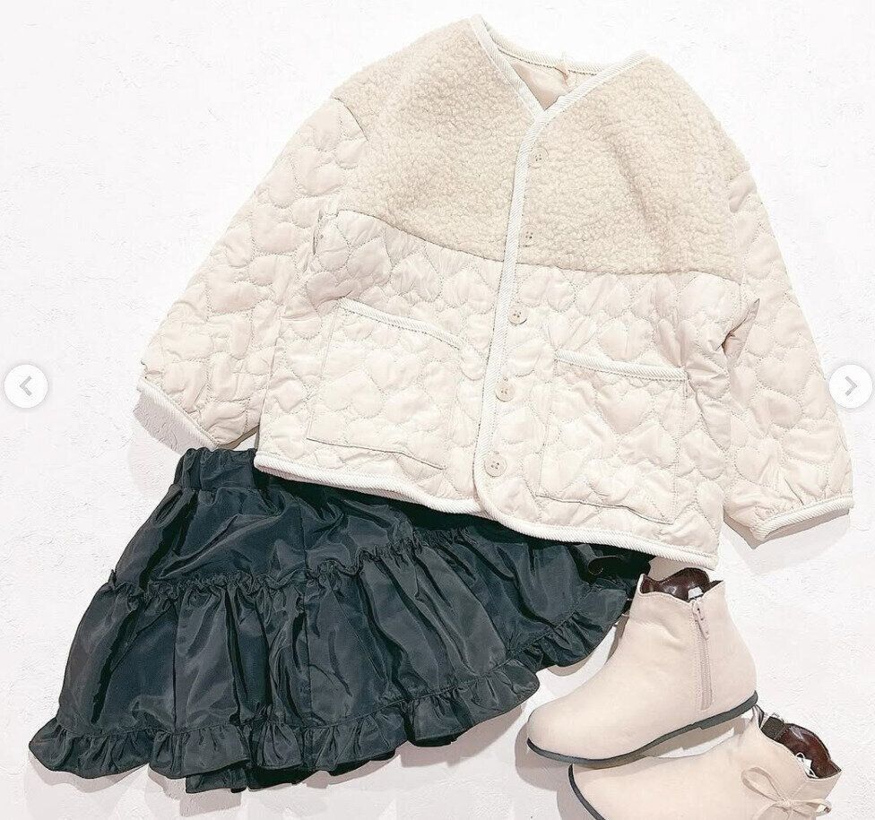 yumi___256さんが発見したのは、ボア×ハート柄キルトの切り替えジャケット。クマのキーホルダーが付属しており、お子さんたちもとても気に入っているんだとか。お出かけシーンにはもちろん、軽くて風を通しにくいため、外遊びにもぴったりなんだそう♪ こちらは2,187円で販売されているとのことです。