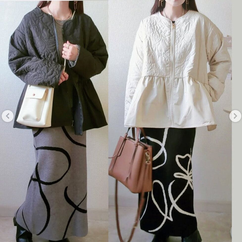 _da_aco_さんがしまむらで発見したのは、こちらのジャケット。厚手すぎず風を通さない生地で、「車移動が多い私にぴったり」と2色買いしたんだそう!ペプラムシルエットはもちろん、キルト部分が花柄になっており、とても可愛いデザインですよね♪