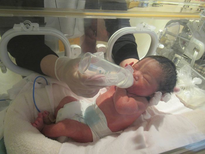 病院での面会時間は、大人1人のみで30分。2人一緒ではダメでどちらかのみだったので、夫と交代で娘に会いました。無菌カプセルの中に手を入れて抱っこして、持って行った母乳を哺乳びんであげたりして…。毎日母乳を届けに行っていましたが、面会時間の30分は毎回本当にあっという間でした。