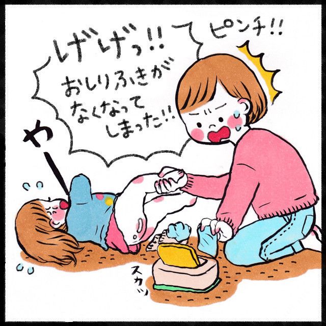 逃さないよう素早く替えようととおしり拭きに手を伸ばすと・・・