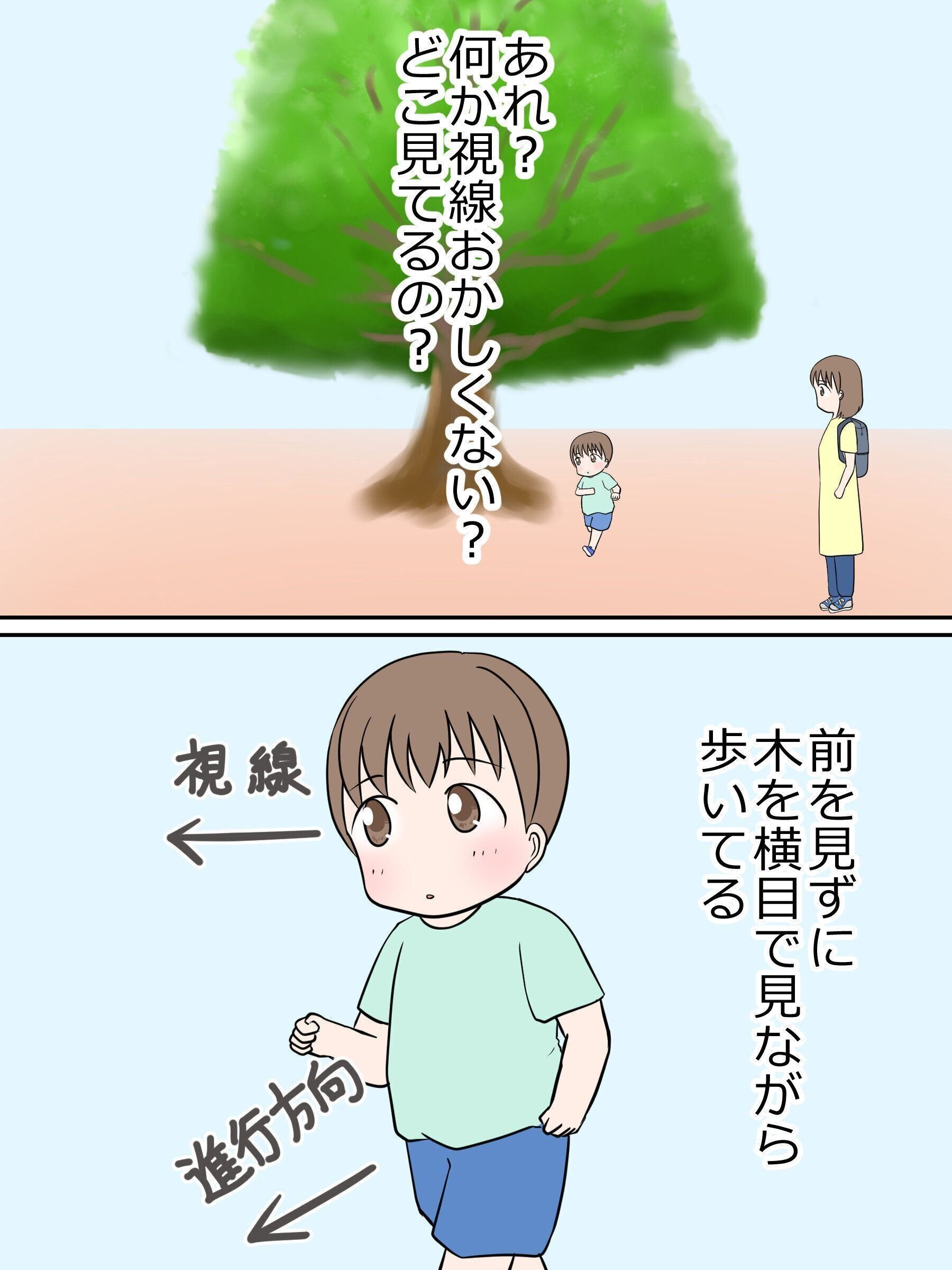 前を向いて歩かず、生えている木を横目に見ながら木の周りをグルグル歩いていました。