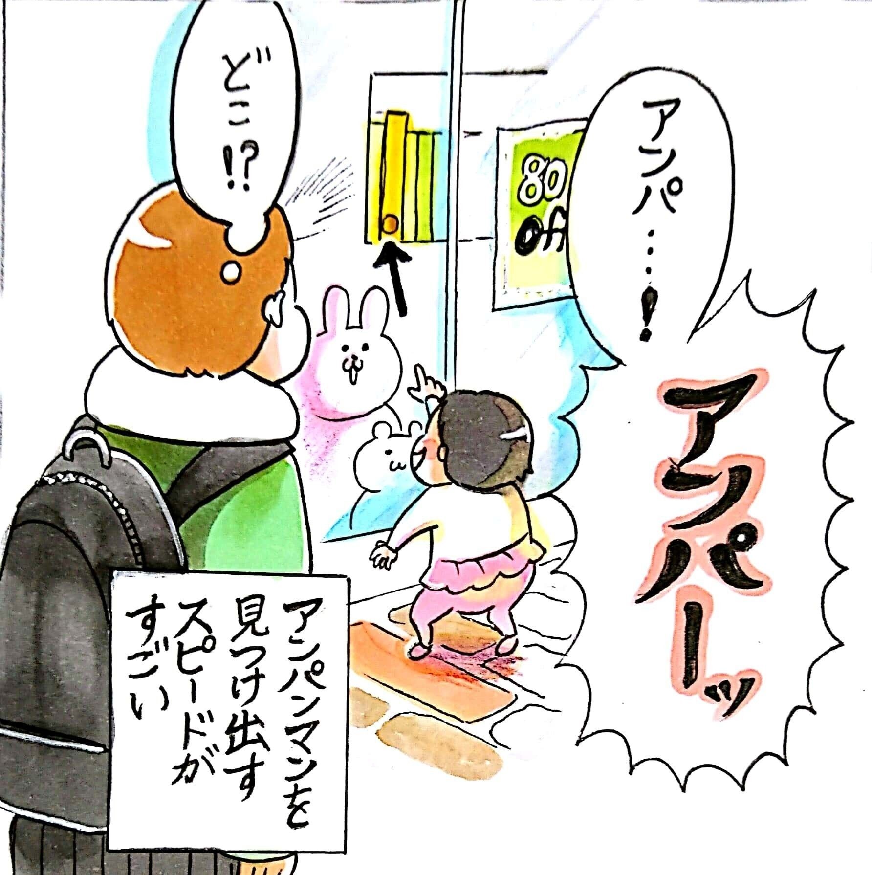 「娘はアンパンマンを発見する天才です。親の私も気づかないような小さなアンパンマンでも、街中でスピーディーに見つけられます。すごい!」