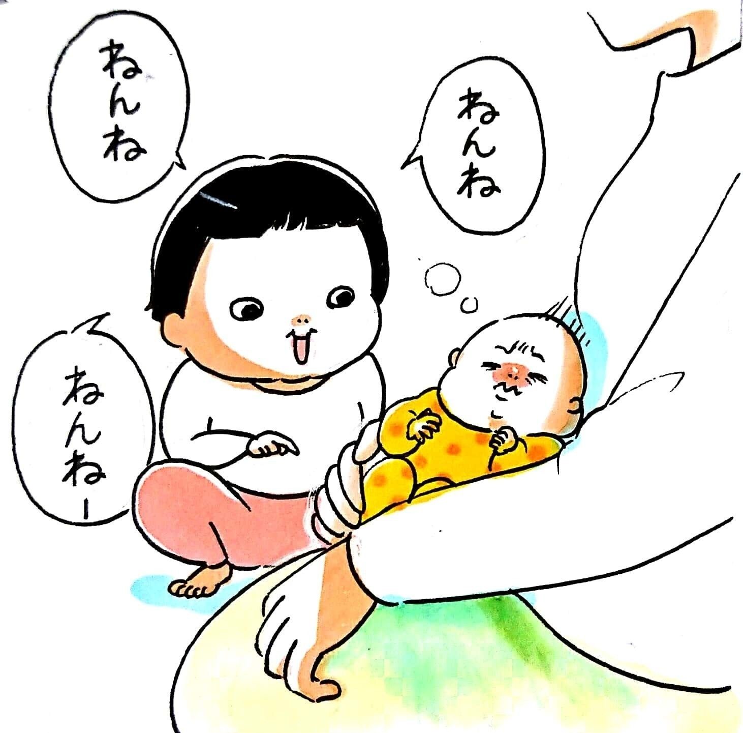 「低月齢の小さな赤ちゃんを見ては『ねんね』と呼びます。確かにねんねしてるけどね…。自分のほうが先輩赤ちゃんだと自覚しているのでしょうか」
