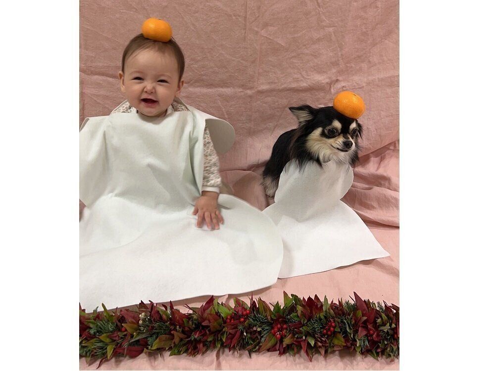 2025年もよろしくお願いします。お姉ちゃんのロゼちゃんと一緒に鏡もちに変身!みかんは中身をくり抜いて、おもちはフエルトで手作りしました!どちらかのみかんが落ちたり、仲よし姉妹の楽しい撮影会でした!