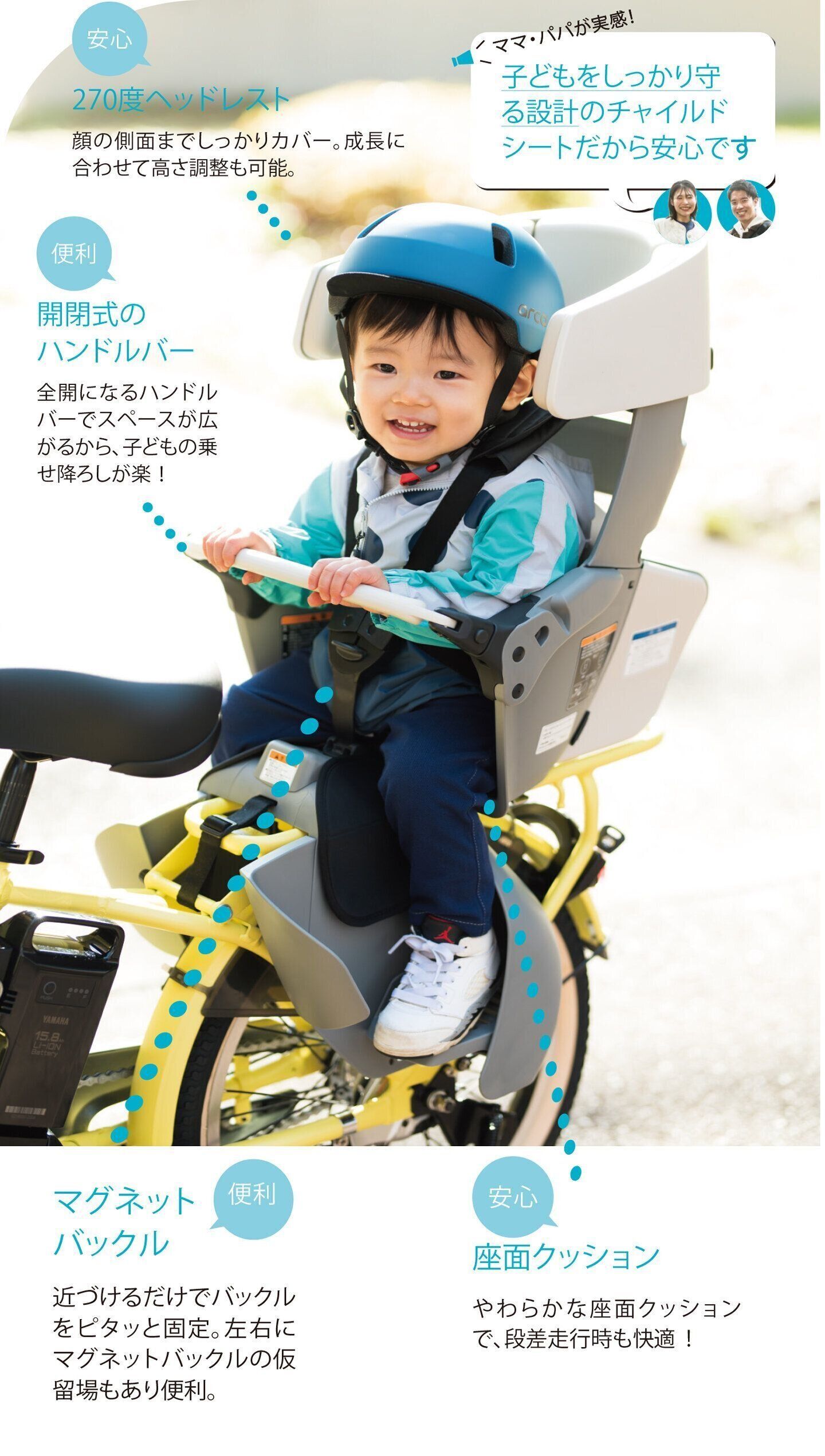 大切な頭や体をハグするように守る、後ろ乗せチャイルドシートを搭載。子どもの乗せ降ろしが楽にできる、うれしい工夫にも注目です!