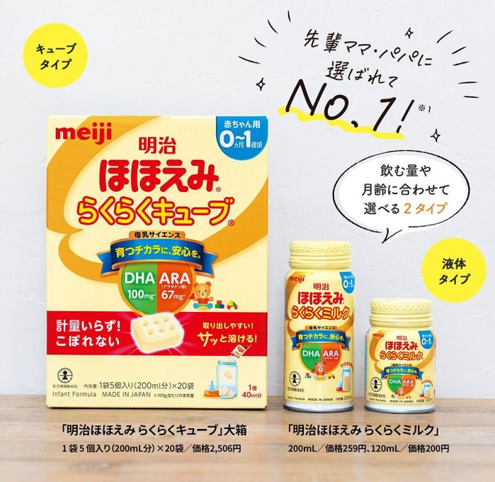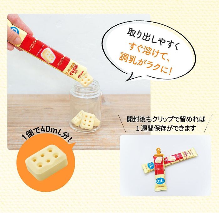 計量不要で取り出しやすく、すぐに溶けるキューブタイプ。キューブ 1個で40mL分と少量から作りやすく、生まれてすぐの赤ちゃんの授乳にとくに便利です。個包装なので、使いたい分だけ使えて衛生的。開封しなければ長期保存も可能です。