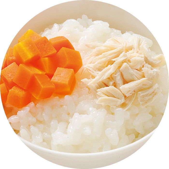 ごはんは軟飯。大きさはにんじんなら7mm角くらい。鶏肉はほぐして、短く切る。食べさせる量は子ども用茶碗1杯弱くらい。