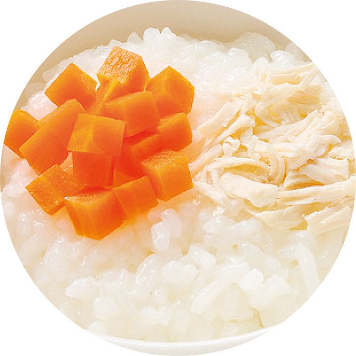 ごはんは軟飯。大きさはにんじんなら7mm角くらい。鶏肉はほぐして、短く切る。食べさせる量は子ども用茶碗1杯弱くらい。