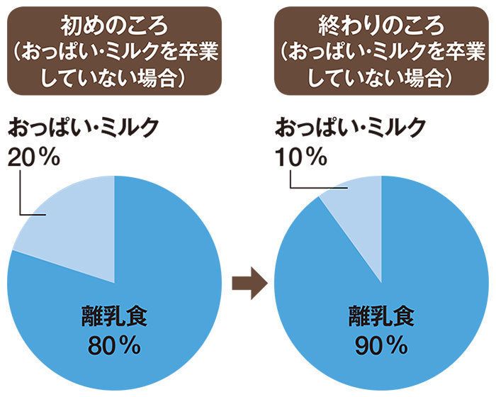 栄養は、ほぼ離乳食からとるように。卒乳していない場合も、栄養の約75%を離乳食からとり、幼児食へ移行するころには約90%になります。