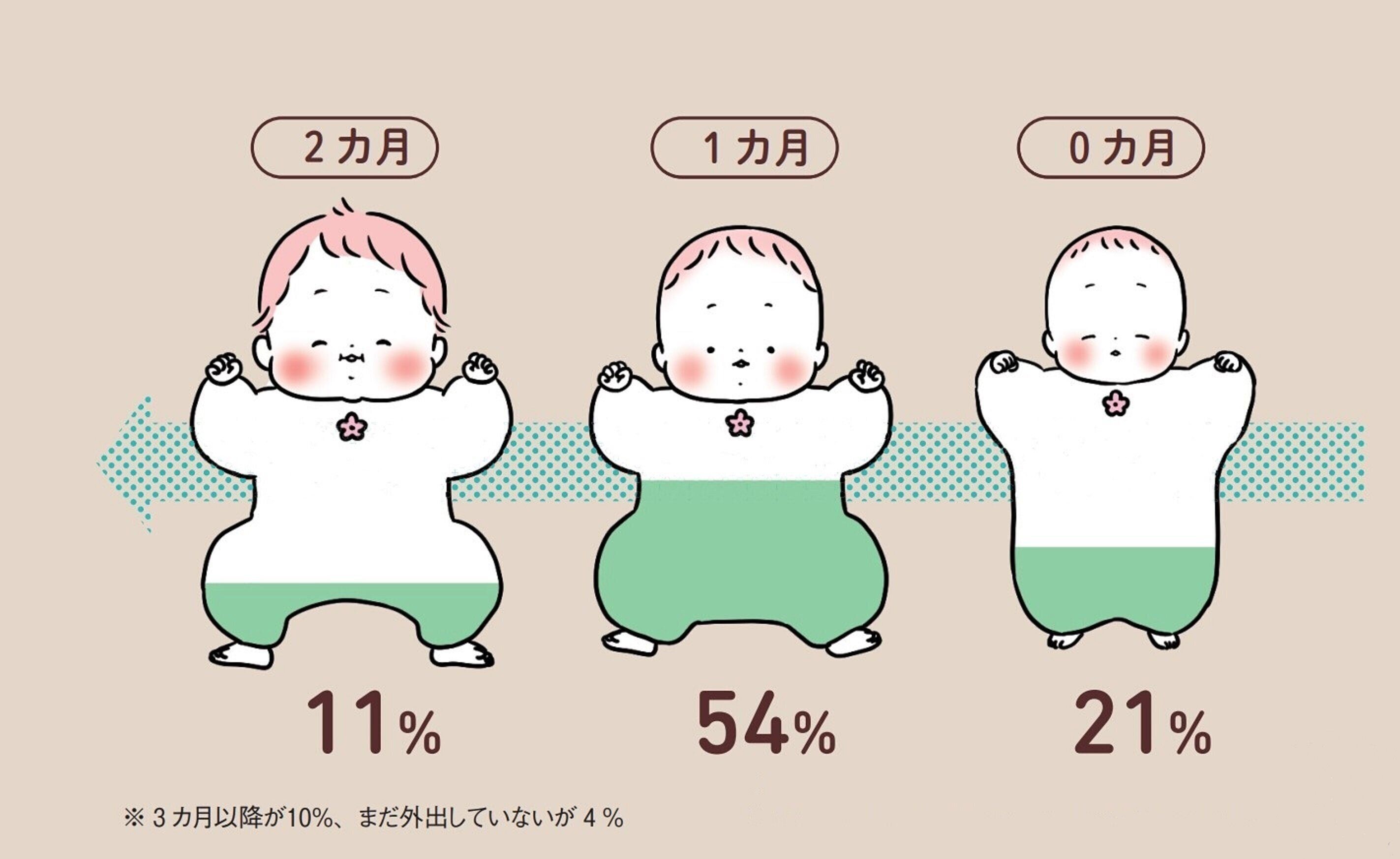 近所をお散歩するレベルの“プチ外出”をいつ始めたか聞いたところ、1カ月健診を終えたタイミングで、初めてトライしたファミリーが多くいました。ただし、2人目以降の赤ちゃんの場合は、上の子関連の外出もあり、0カ月でお出かけを経験するファミリーも少なくないようです。