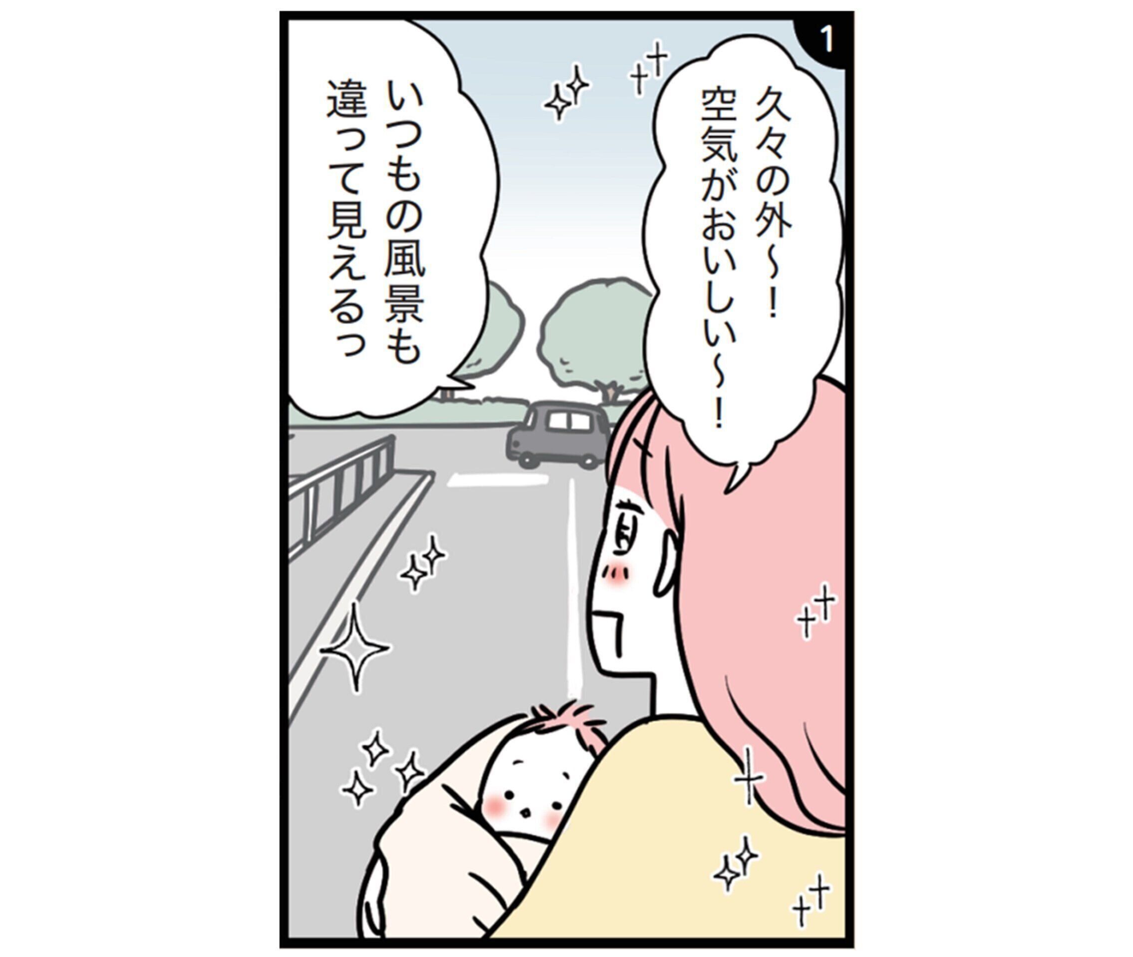 「『そろそろ外の世界に出たい!』と考えたのと、息子にも外の空気を吸わせてあげたかったので、1カ月と1週で外出を決意! 機嫌のいい夕方の時間帯にガーゼのおくるみで包んで抱っこしながら、何も持たずに出ました。わが子を抱っこしながら歩いているのが不思議で、見慣れた景色がすごく新鮮に感じました。」