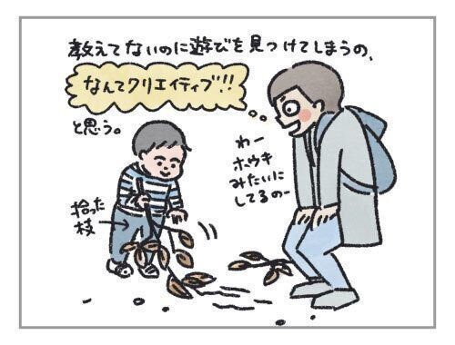 なんでもオモチャにしてしまう、「見立て」の力にも感心します。円盤状のものがあれば、両手で持ってクルクルと動かし「ブーブー」と言いながら、車を運転するように歩き回るし。公園で拾った枝があれば、地面に線を描いてみたり、ホウキのように掃いてみたり。そんなこと親が教えてないのに、遊びを見つけてしまうんですよね!なんてクリエイティブなんだ!!と驚きます。