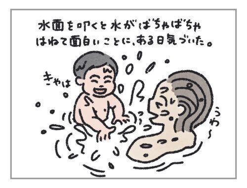 子どもが1才になるかならないかぐらいのある日、お風呂で水面をたたいて遊び始めました。多分、手を動かした時にたまたまお湯がばちゃばちゃはねて、面白いと気づいて、何度も遊び始めたんだと思います。急に自分から遊び始めた!という感じがして・・・顔面にお湯攻撃を受けながらも、その成長に感激したのを覚えています。