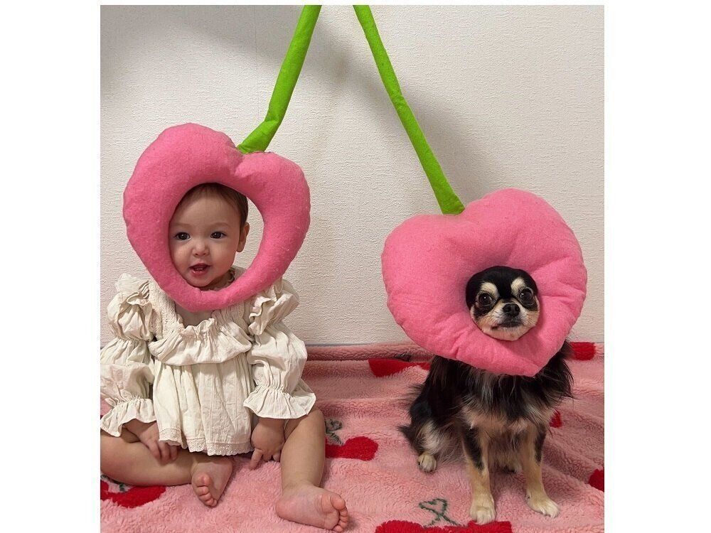 りせ母がフェルトで、愛犬のロゼちゃんと一緒にハートのさくらんぼになれるかぶりものを作ってくれました。ロゼはるるちゃんが生まれたときからの親友です。最近は一緒に遊べるようになって、ロゼもうれしそうにおもちゃを持ってきて大喜びです