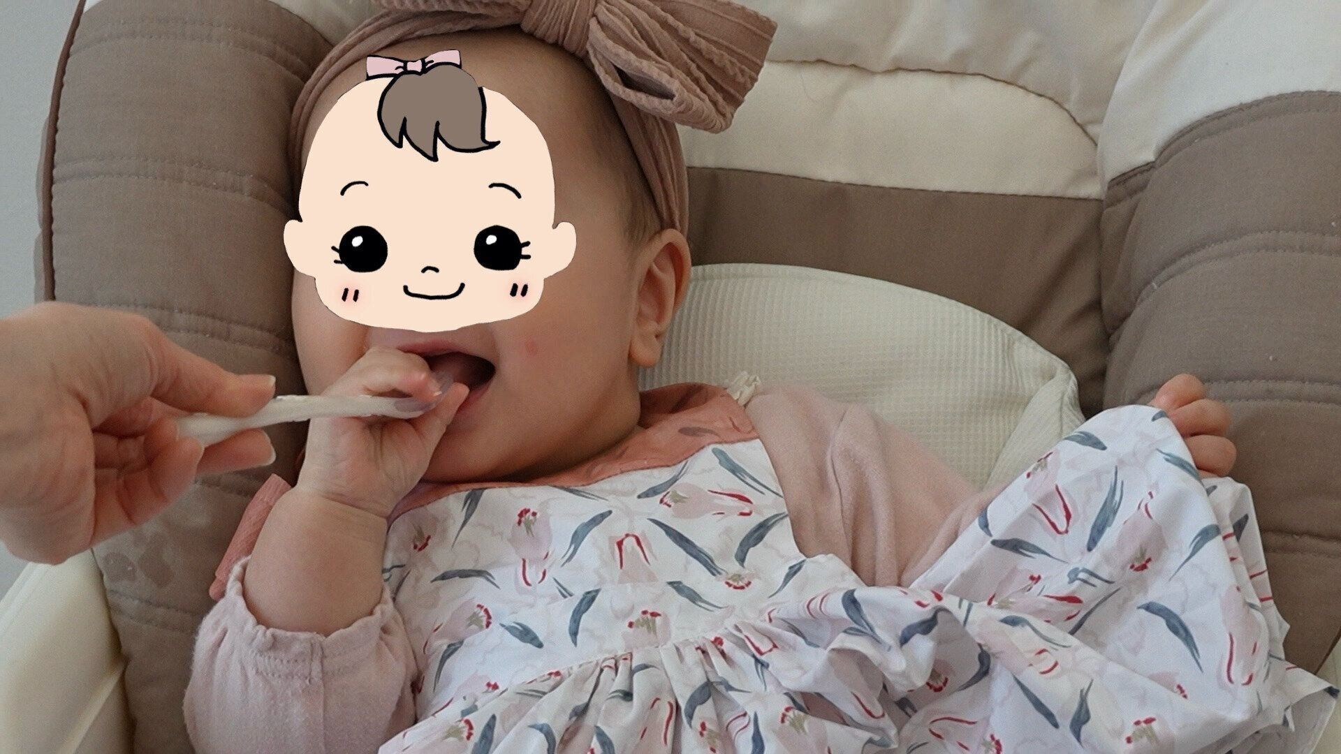 離乳食は生後5~6カ月ごろを目安に、子どもの食への関心の表れなどを見てスタートというのが一般的ですが、今回、二女は生後6カ月ごろからのスタートとなりました。