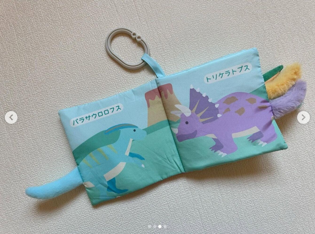 こちらはkoikoi3_さんが3COINSで一目惚れしたという布絵本。絵本から飛び出ている恐竜のしっぽがとってもキュートですよね。ふわふわで触り心地も良さそう♪ クリップ付きなので、お出かけ時にも重宝しそうです◎