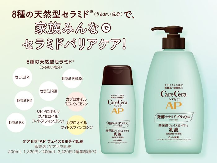 おふろ上がりのスキンケアには、なるべく素早く全身ケアできて保湿感もあるアイテムがぴったり。「ケアセラ®︎AP フェイス&ボディ乳液」は、ワンアクションで中身が出せる大容量ポンプ(400mL)とボトル(200mL)で、忙しいときにも便利です。すーっと肌になじむ滑らかなテクスチャーで全身に塗りやすく、子どものケアのついでに自分自身のケアも一緒にできちゃう!