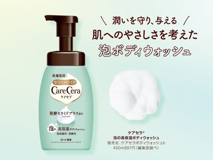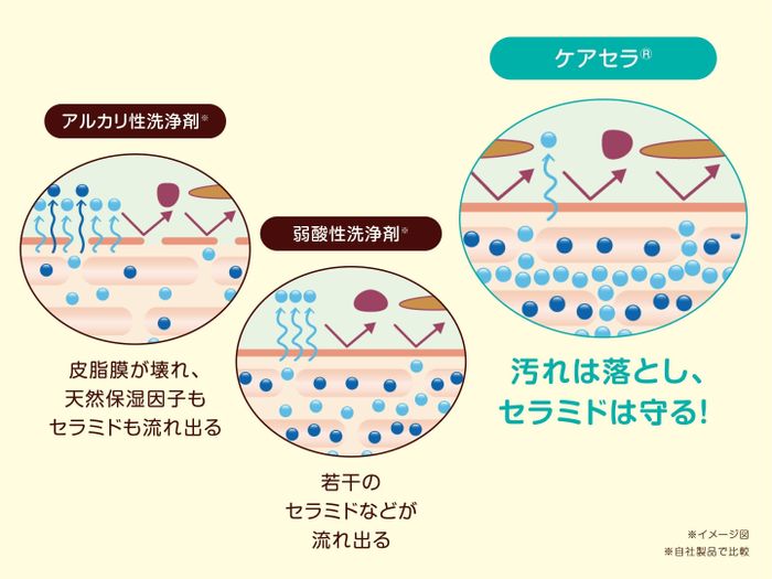「ケアセラ®︎」は、セラミド※を守って汚れだけを落とすロート製薬独自の洗浄技術を採用。さらに、乳液と同じうるおい成分※を配合しているので、洗いながら保湿ケアまでできるんです。