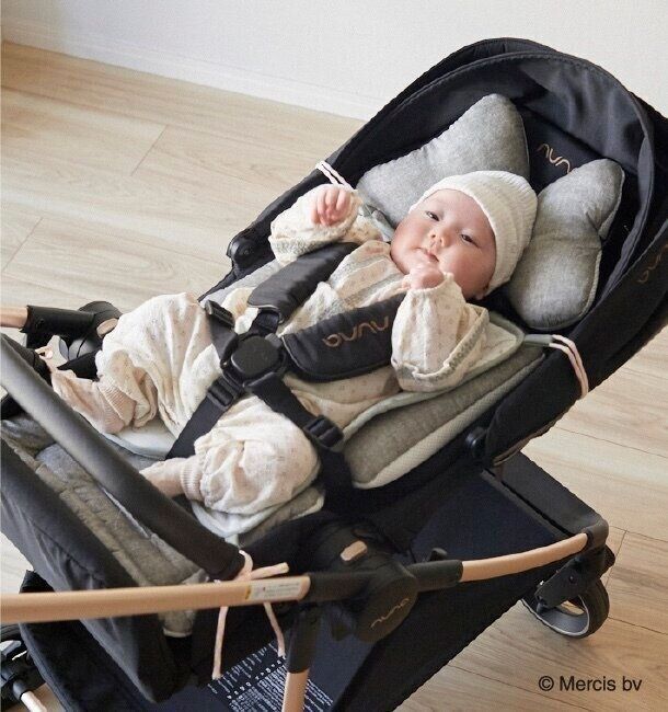 柄のある面は触るとひんやりする「接触冷感」素材を使用しています。夏になって暑くなってきたら、ベビーカーにマットをのせ、ひもで固定すれば、暑い日のお出かけもご機嫌に過ごせます。汗をかきやすい背中にマットを挟むのがポイント。チャイルドシートや抱っこひもにも応用できます。