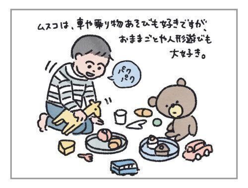 ムスコは、車や乗り物遊びももちろん好きですが、おままごとや人形遊びも大好きです。妊娠中に性別がわかった時は、男の子だと一緒におままごとはしてくれないかな・・・と思っていたのですが、全然、してくれますね!ぬいぐるみに何か食べさせたりするの大好きで、楽しいです。