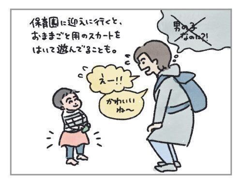 保育園に迎えに行くと、たまに、おままごと用のスカートを履いて遊んでいるムスコ。初めて見た時は、「えー!」とびっくりして、ついつい「男の子なのに変なのーー」とからかいそうになったのですが・・・ふと気づいて、我慢。今はもう、そういう時代じゃないですよね。性別に関係なくファッションは自由だし、お化粧だってするようになるかもしれない。「かわいいねー」と一言声をかけました。
