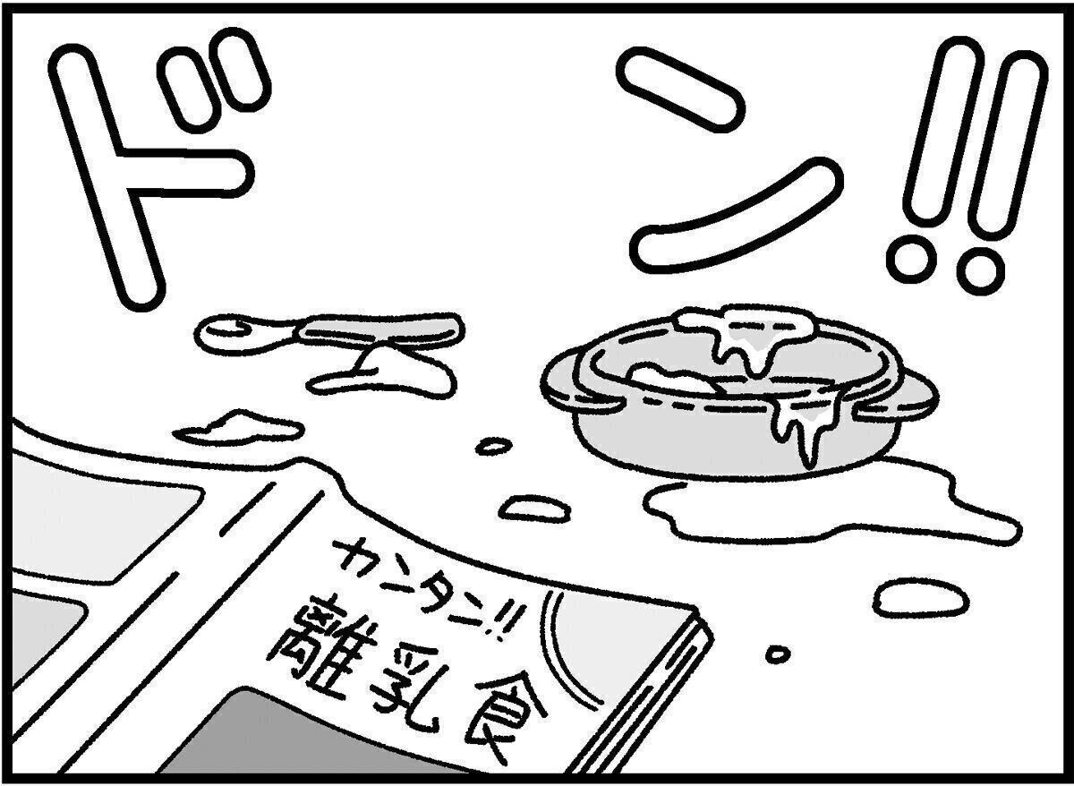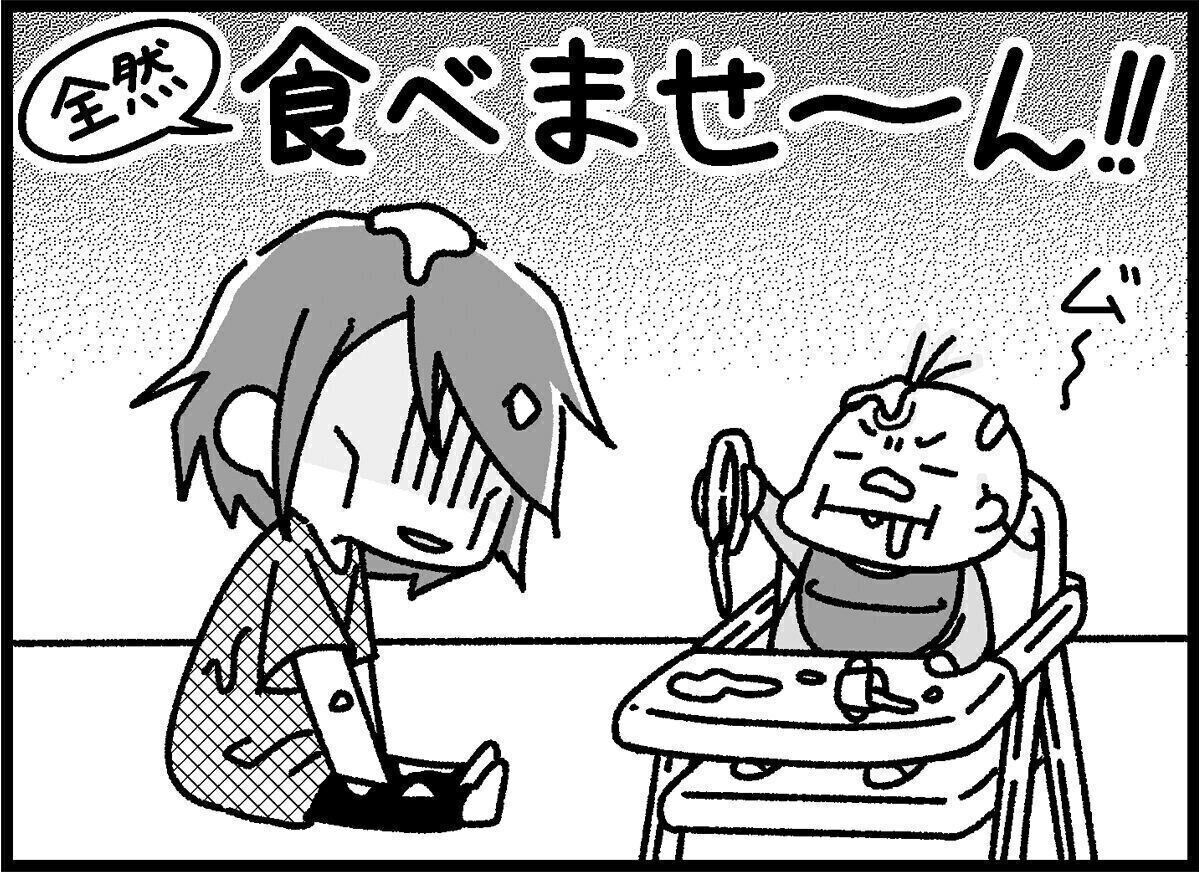 ところが、娘・ふーみんは離乳食を全然食べてくれません。離乳食開始時こそ「また舌でベーッて出してしまったなぁ。まぁ最初はこんなものよね(笑)」と軽く受けとめていたのですが、それが何か月も続き、一向に進まない状況。母乳やミルクはしっかりとっていたのですが、何か月も続くと栄養面が心配になってきます。調乳の手間と離乳食作り、そして離乳食のたびに皿をひっくり返したりするので、台所やテーブルの周りは壮絶に散らかっていました。