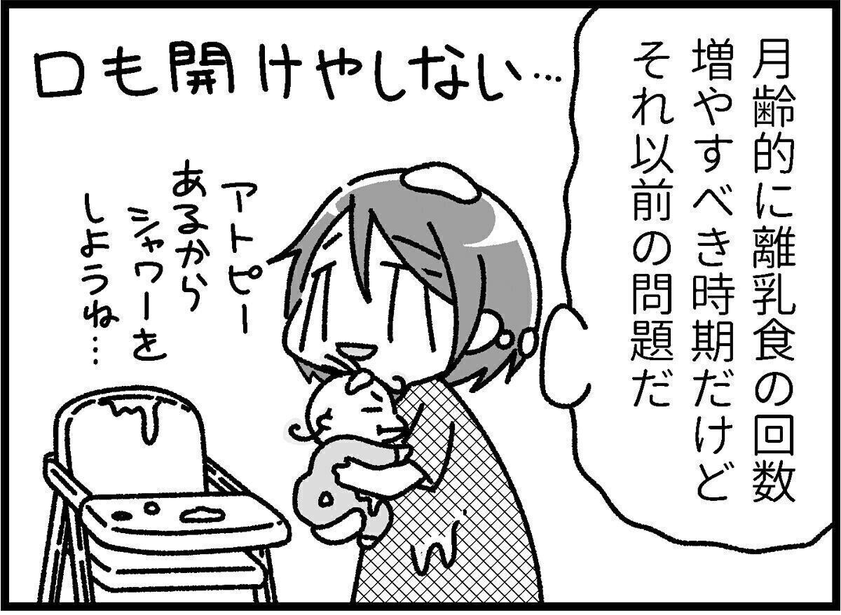 さらに、食べはしないけど、体じゅうに食べ物を塗りたくったりするのです。肌に食べ物が付着しっぱなしだと食物アレルギーのリスクが上がってしまうし、そもそも娘はアトピー性皮膚炎があるため、我が家では毎食後にシャワーを浴びさせていました。離乳食に、ボディケアに……疲労困憊です(アトピーと離乳食については、「マンガでわかる!子どものアトピー性皮膚炎」という本にまとめています。ご興味のある方はどうぞ!)。