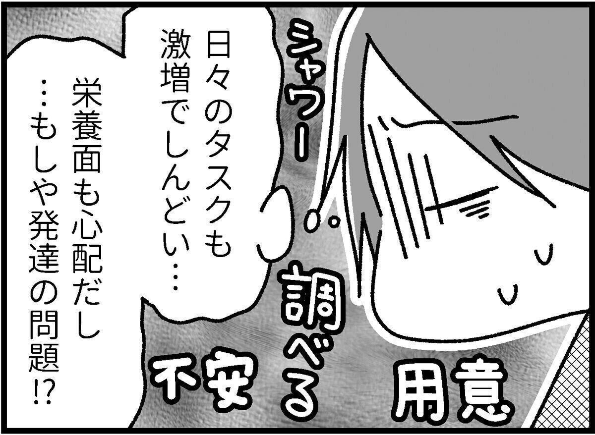 当初は離乳食を作っていたのですが、全然食べてくれないため、私は作っては捨てるのを繰り返すことがつらくなり、市販のベビーフードを使うようになりました。ところが、それもまた食べないんです。栄養面の不安、先行き不透明なことによるストレス、食べ物を捨てる苦痛、離乳食について調べては提供して掃除をして終わる1日。さらに食物アレルギーのリスクを下げるには、離乳食開始時期も、代表的なアレルゲンの摂取時期も遅らせないほうがいいとのにまったく進まないのが心配で……何もかもがつらすぎて病みそうでした(※1)。