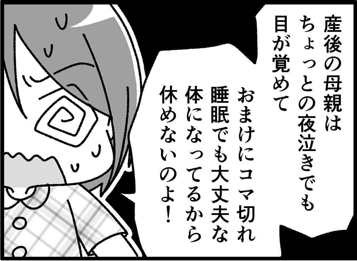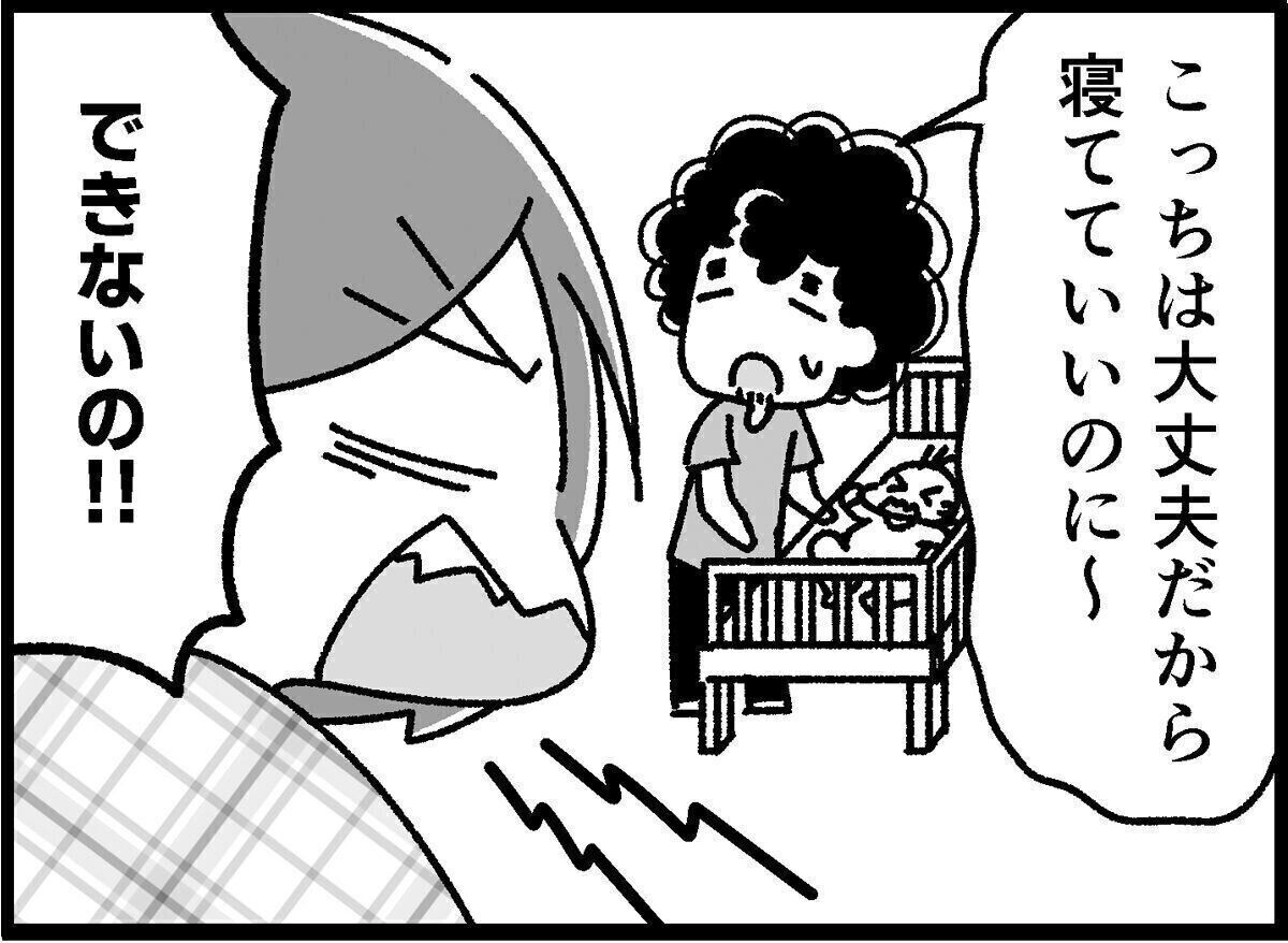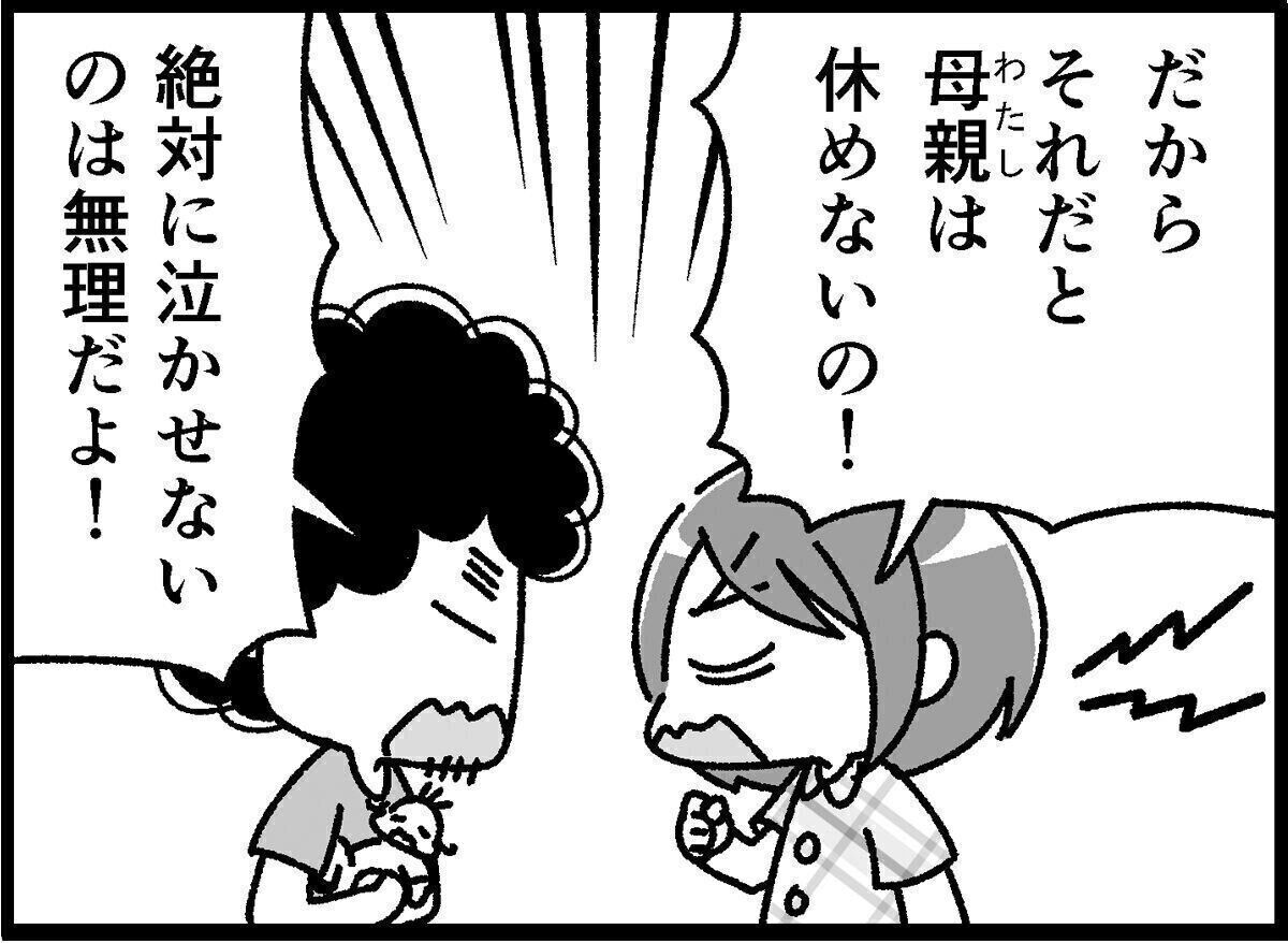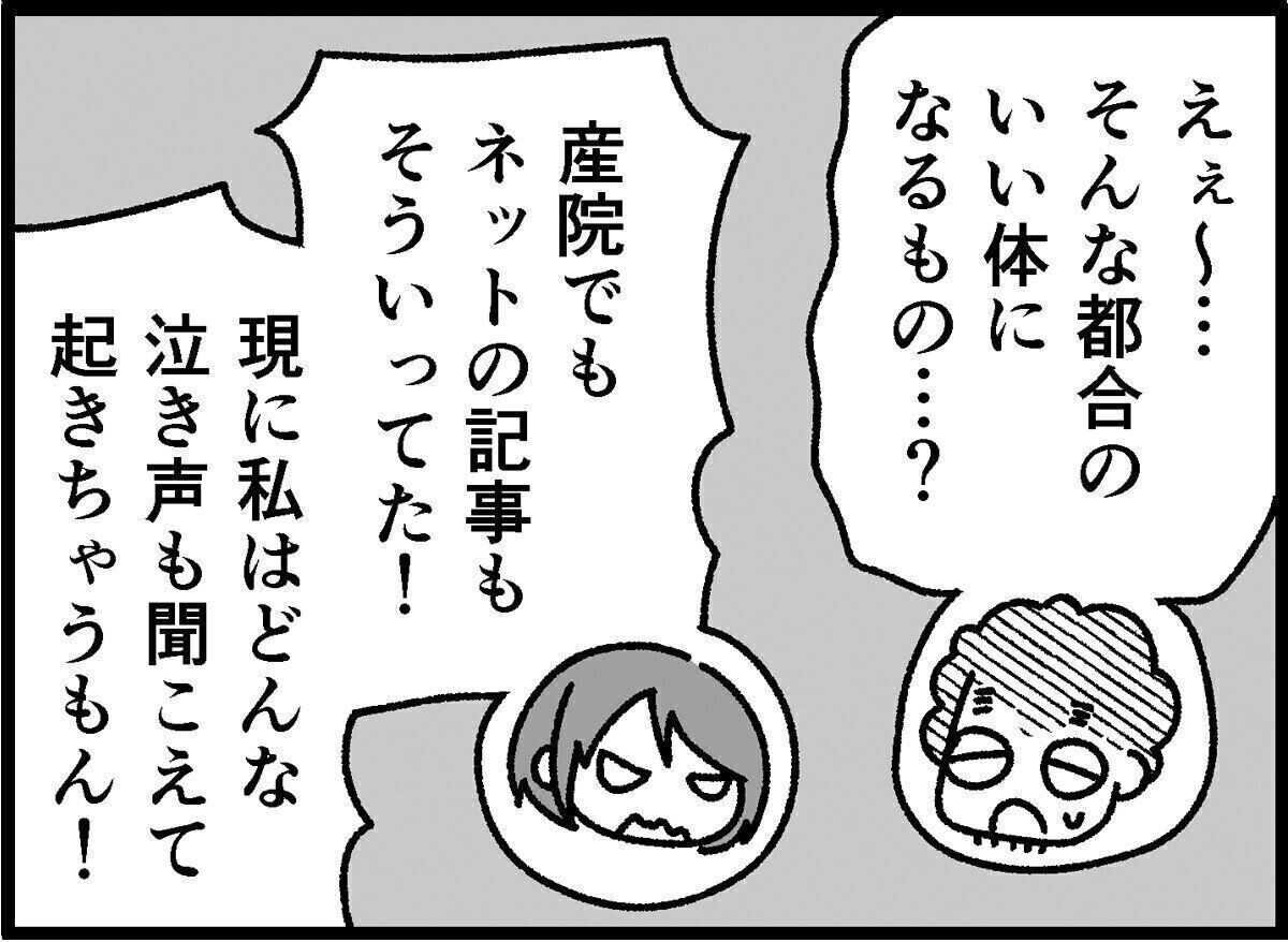 それに対して夫は、少しも泣かせないのは無理だと主張したのですが、私は「母親は、赤ちゃんの泣き声が聞こえると起きちゃう体になってるんだから! これじゃ全然休めないよ!」と反論。夫はびっくりして「そんな便利な体になるもの?」と訝しんでいましたが、産院の医療スタッフさんやネットのママサイトの記事で「母たるもの、子どもを産んだら赤子の声ですぐに起きるモードになってしまう。母の特別な能力なのだ!」と見聞きしていた私は「赤ちゃんの泣き声が聞こえる中では休めない」と主張しました。