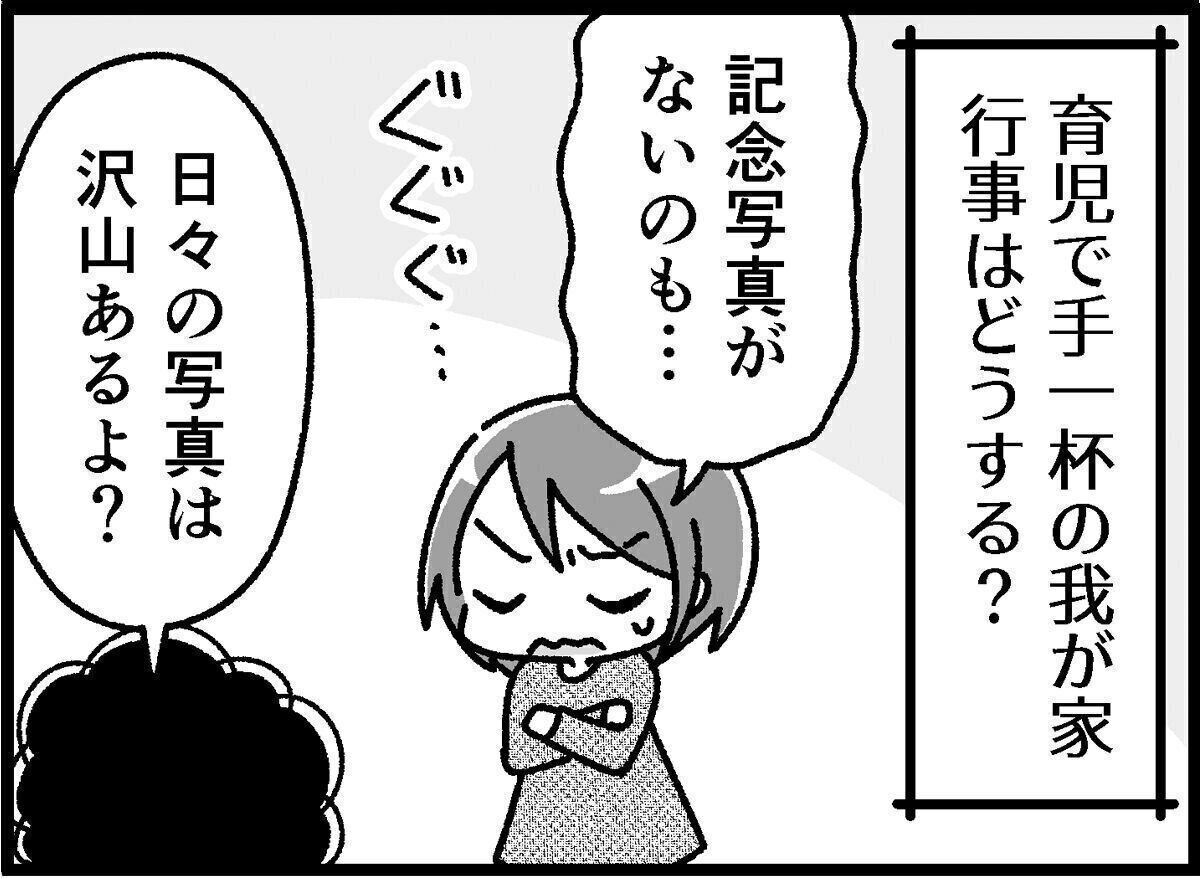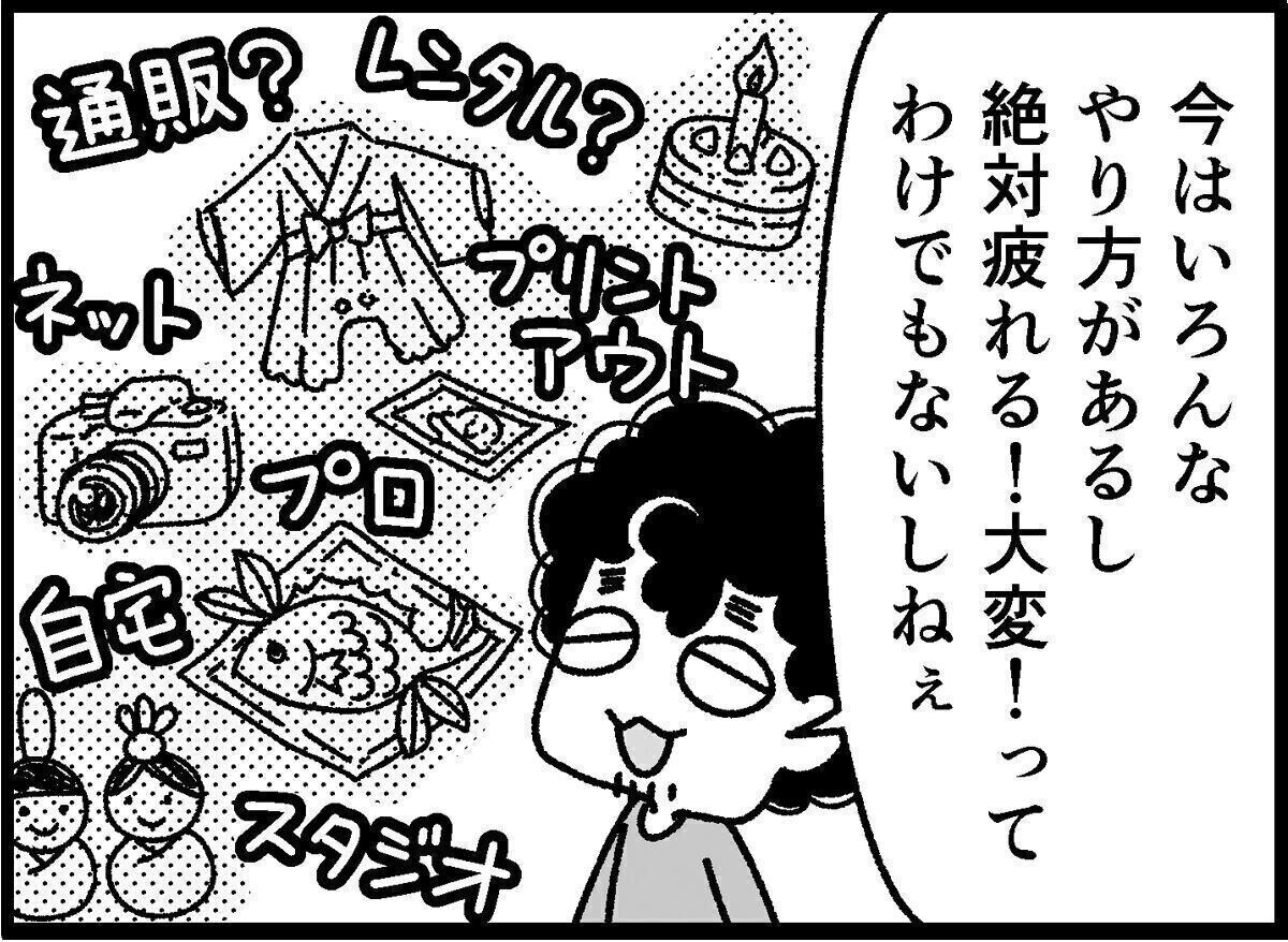 写真を撮れないことにモヤモヤするのかと思ったのですが、写真は日々たくさん撮っています。特別な記念写真が撮れないことが引っかかるのかと考えてみたものの……特別な衣装を家族分そろえて特別な手順を踏み、特別な場所で撮ってもらうと考えると……やっぱり気が重い。