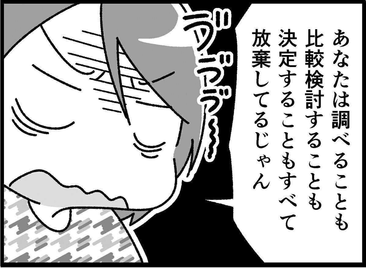 「もう無理! これ以上、一人で調べたくない! 情報収集、比較検討、決断と全部私がやってるでしょ。相談しても何も答えてくれないし。そのうえ全責任を負うなんてツラい! 荷が重すぎる!」