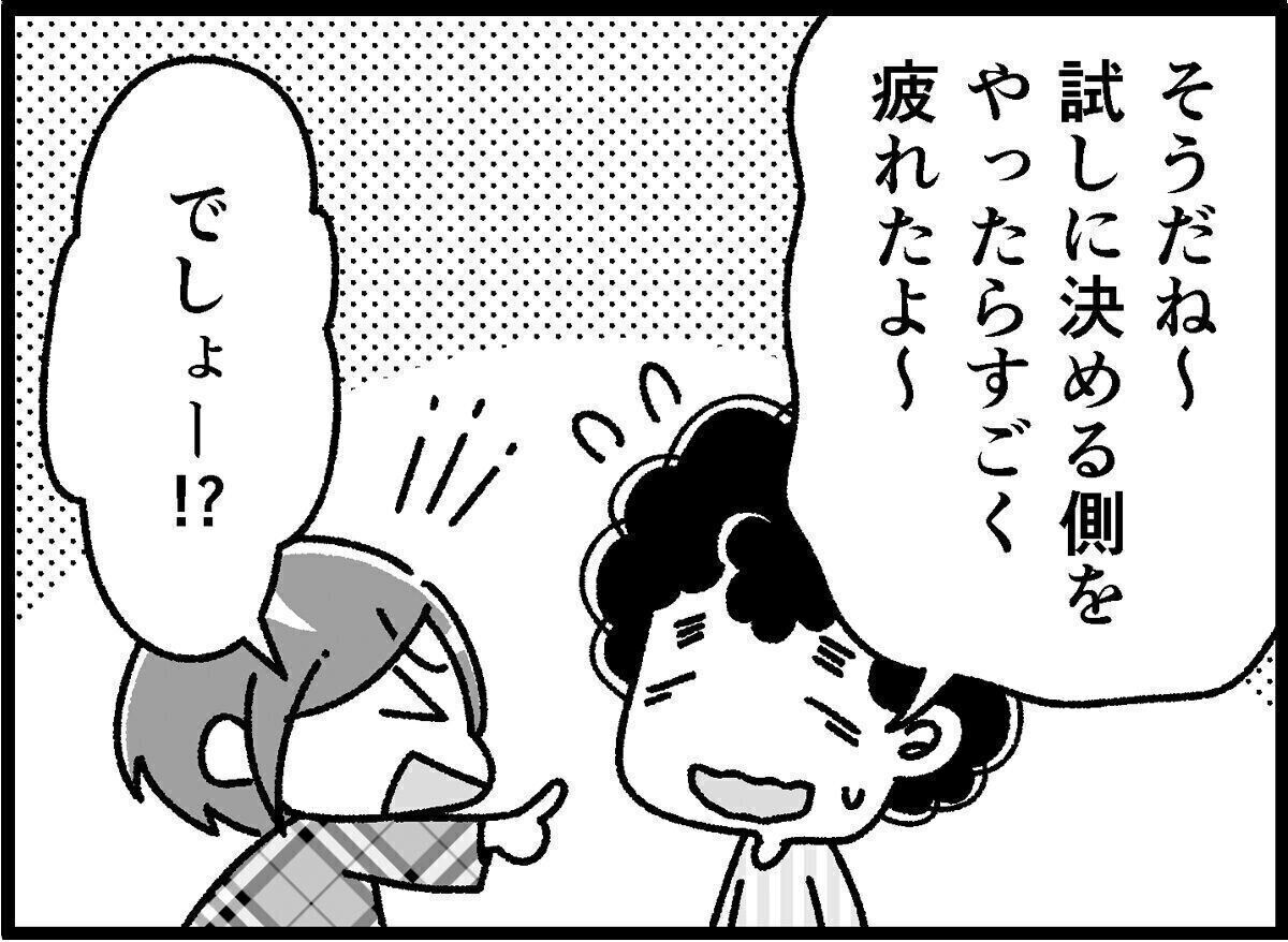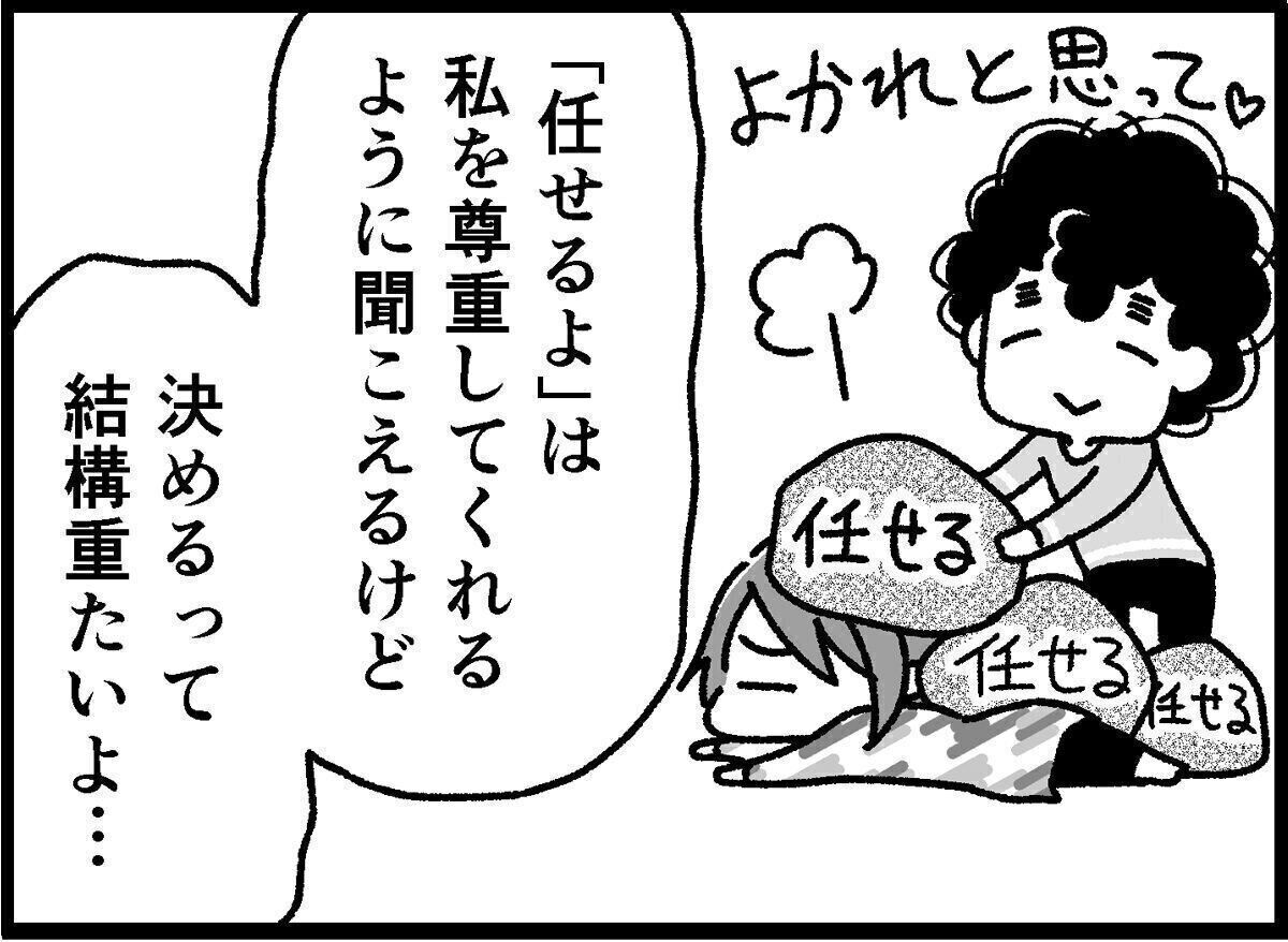 「任せるよ〜」の一言で、夫に子育ての様々な選択・決断を委ねられ、重圧を感じていた青鹿さん。ある日、とうとう夫に「もう無理!」と怒ってしまいます。そして「決める側」と「任せる側」の責任の範囲、ルールを決めることにしました。