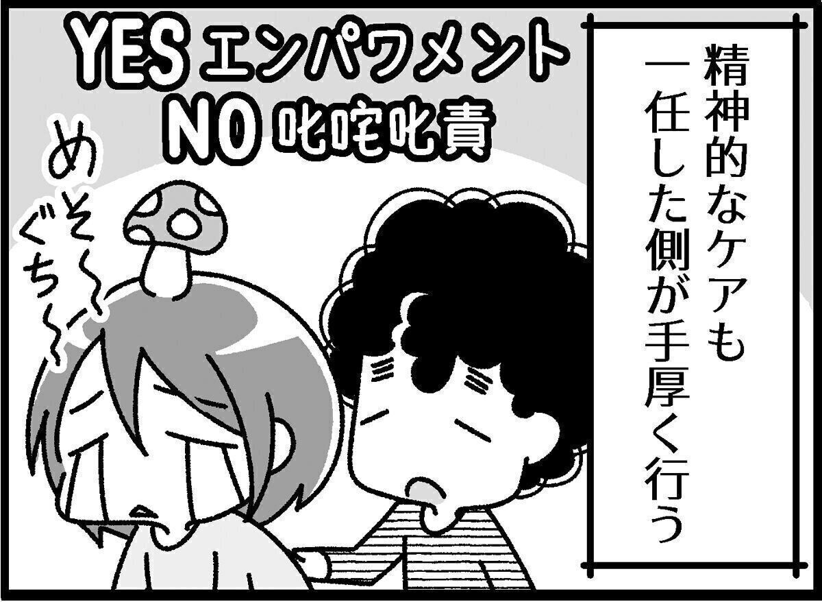 相手が決めた時に何か問題があったら対処する。また、決めた側が失敗して落ち込んだら、問い詰めたりせずにエンパワメント(元々持っている力を信じたり、自信が持てるような声掛け)を心がける。