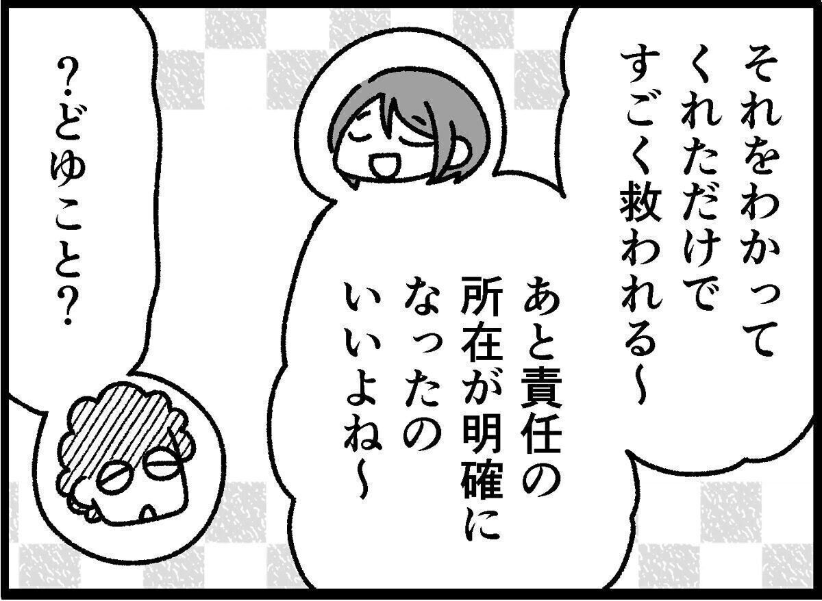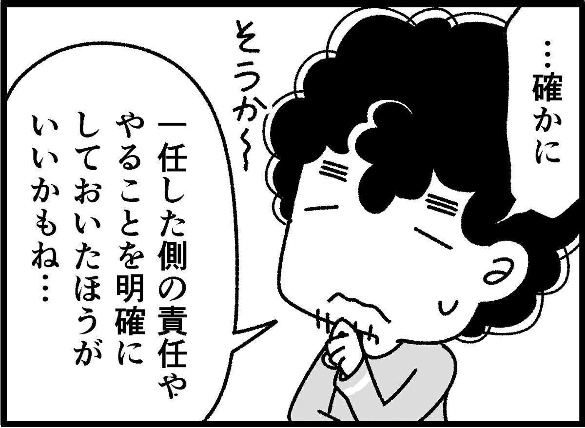すると夫が「自分も結果に責任を負うとなると、少しは把握しておかないと、と思うようになったよ。今まで適当に任せるなんて言って、何の責任も負ってなかった僕はずるかったね」と言ってくれました。これまで全体を把握してるのは私だけだったし、何か問題が起きた時の対処も私がしていたからです。