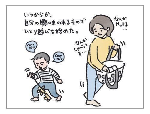 いつからか、ひとり遊びを始めた子ども。奥からオモチャを引っ張り出してきて、独特な遊び方をしていたり、何言ってるかよくわからないけどおしゃべりしていたり。親の私が誘導したわけではない、子どもなりの興味を持って、クリエイティブに遊んでいる様子(ハハのさけび#32参照)を見ると、1人の人間だなあという感じがします。