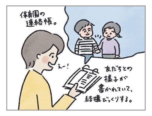 保育園に通い始めてからは、毎日の連絡帳が楽しみ(ハハのさけび#27参照)。同じクラスにお友達ができて、「今日は◯◯ちゃんと手をつないで歩いていました。」みたいな、家では見られない様子を読むと、結構びっくりします。考えてみれば、子どもは1日の大半を保育園ですごしてるんですよね。子どもにとっては、保育園の先生やお友達は、すごく近しい人なんだ・・・とか考えると、私の目が完全には及ばないコミュニティに、すでに属しているんだよなあと実感します。