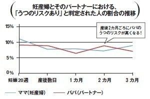 ※2012年から愛知県西尾市の保健センターにて、妊婦とそのパートナー270組を対象に、妊娠20週から産後3カ月までの計5時点でメンタルヘルスのスクリーニングを行い、うつのリスクを判定。