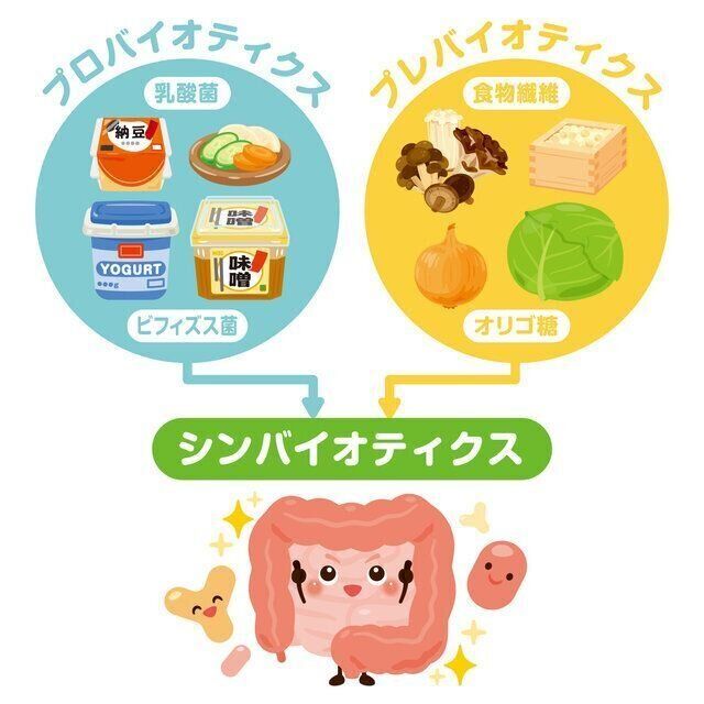シンバイオティクスの「シン」は一緒に、という意味ですが、善玉菌となる「○○菌」がつく食べ物(=プロバイオティクス)と菌のエサになるもの(=プレバイオティクス)、この2つを一緒にとることにより、相乗効果が得られ、腸内の善玉菌が増えやすくなるという考え方です。
