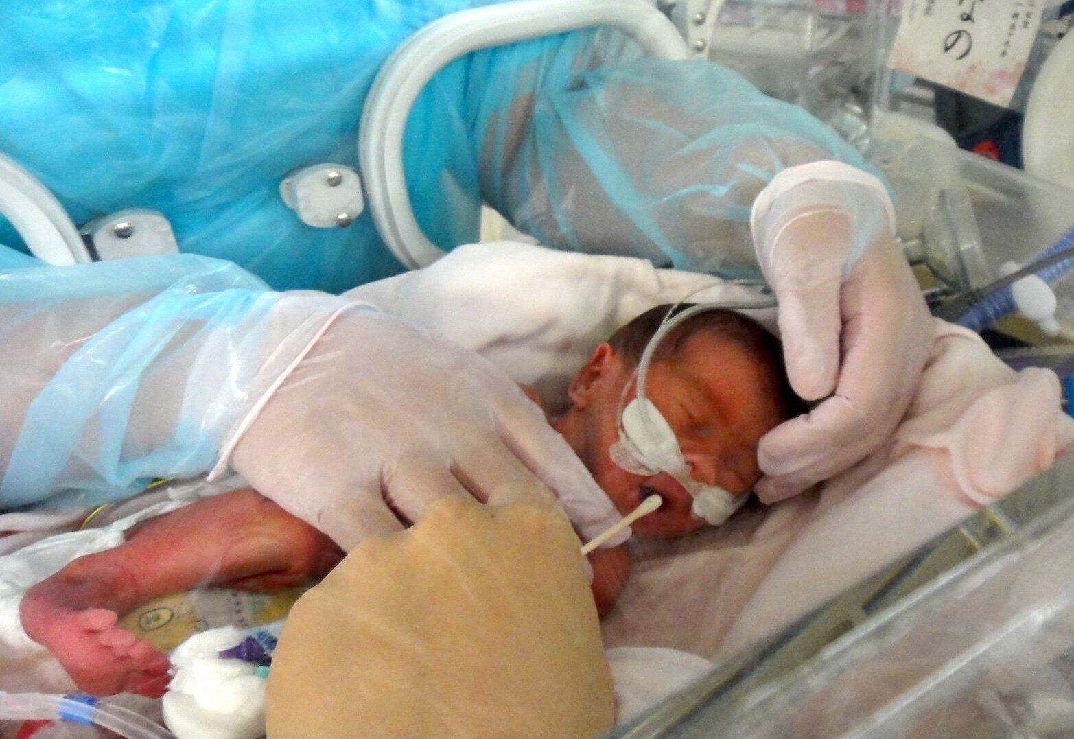 「私も酸素や点滴などがついた状態でふらふらしていましたが、看護師さんに車いすを押してもらってNICUへ行きました。目がよく見えなかったので、保育器に手を入れて触れてみて、ようやく『赤ちゃんを産んだんだ』と実感しました。小さな体はとてもあたたかかったです。