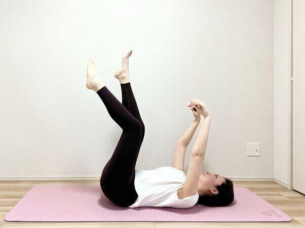 (1)仰向けに寝て両手両脚を天井に向かって上げる。