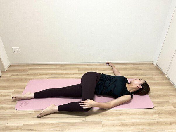 (4)息を吐きながら、右脚を左に倒して30秒ほどキープする。