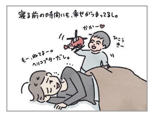 寝る前の時間にも、幸せが詰まっています。まだ子どもがハイハイしかできなかった時、横になっている私の方に、ニコニコしながら頑張って近づいてくる姿・・・可愛かったなあ。寝かしつけている途中、なぜか覚醒してしまって、オモチャでご機嫌に遊びだしてしまうことがたまにあるのですが、それも可愛い。あまりのニコニコっぷりが可愛くて、寝てるふりをしているのに、ついついおかしくて笑ってしまいます。ただし、早く寝てよー!と内心イライラしている時は、笑えませんが・・・