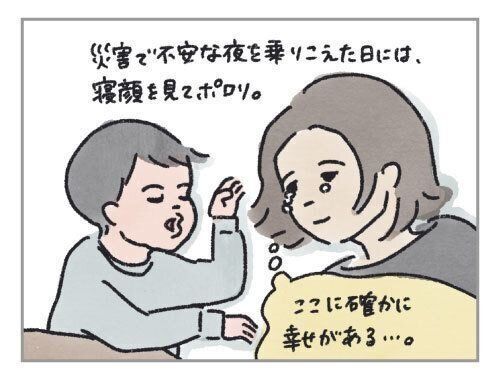 幸運にも浸水を逃れたその夜、スヤスヤと無防備に眠る子どもの寝顔を見たら、なんだか安心して、ポロリと涙が。不安なこと、悲しいこと、大変なこと、生きていれば色々あるけど・・・我が子の安らかな寝顔が眺められること、そこに確かに幸せがあるし、それで十分だし、それ以上のことはないんだと、子どもの寝顔を見て思ったのでした。